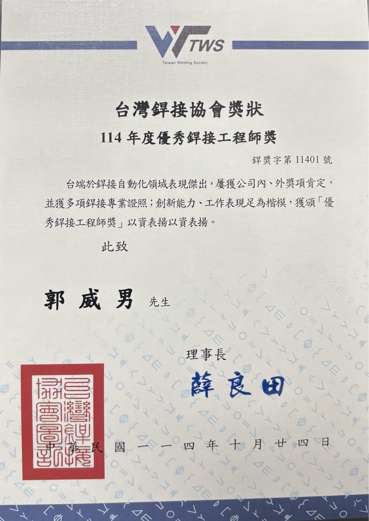 榮獲台灣銲接協會114年度「優秀銲接工程師獎」✦
